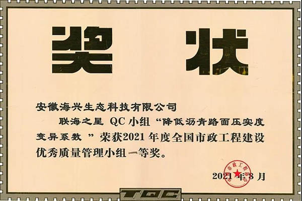 2021年度安徽省市政工程建设质量管理小组一等奖