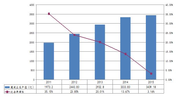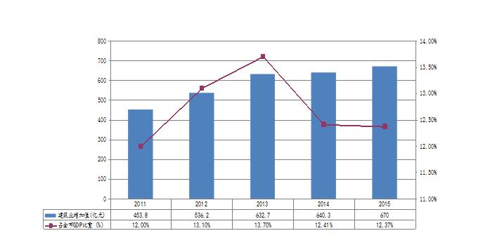 “十二五”期间,建筑业支柱产业地位不断加强。2015年全市建筑业增加值为670亿元,占地区生产总值的12.37%,“十二五”期间全市建筑业增加值累计达到2933亿元,比“十一五”增长152.41%,年平均增长率为20.34%(图2)。2015年全市建筑业入库地税达到53.79亿元,建筑业利润总额为128.45亿元,“十二五”期间全市累计实现利润总额549.53亿元,比“十一五”期间增长4.19倍。“十二五”末全市建筑业从业人员数为104.7万人,比“十一五”末增加52.25%。建筑业成为全市社会经济发展名副其实的支柱产业。