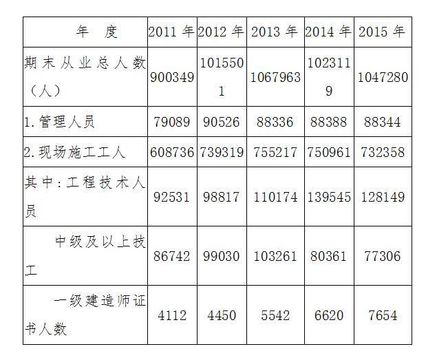 ——队伍建设。大力实施人才培训培养战略,优秀企业家达到100人。注册执业人员总数达到40000人,其中一级注册建造师达到9000人,注册监理工程师达到3500人。各类工程技术人员达到20万人。具有岗位证书的现场管理人员10万人。施工工人达到80万人,中级工以上技术工人达到8万人,实现全行业建筑工人全员培训,持证上岗。