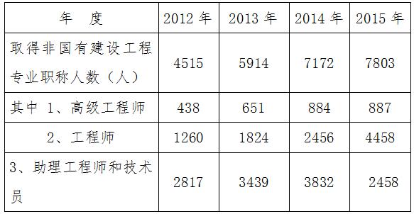 “十二五”期间,我市取得非国有建设工程专业职称人数逐年递增,2011年,我市通过社会化评审取得专业技术人员资格共1603人,2015年增至7803人,如表4所示。