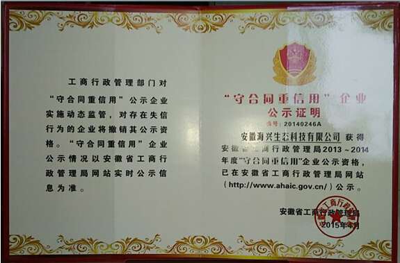 在2013-2014年度省工商局“守合同重信用”单位评选中,我公司再次获此殊荣。