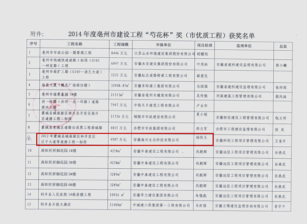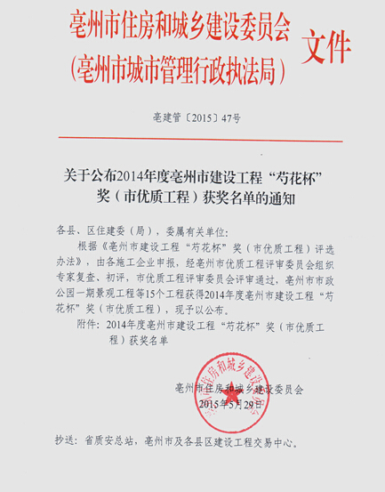 近日,自亳州市住建委获悉,我公司承建的“蒙城县城南新区和开发区庄子大道等道排工程一标段”荣获2014年度亳州市建设工程“芍花杯”奖。
