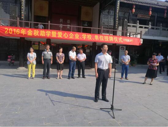 8月29日下午15:00在三河镇万年台广场举办了三河镇2016年金秋助学暨爱心企业、学校、单位授牌仪式。县人大、政协、教育、民政、妇联、县团委等部门的相关领导出席了仪式,我公司荣获“爱心企业”荣誉称号。