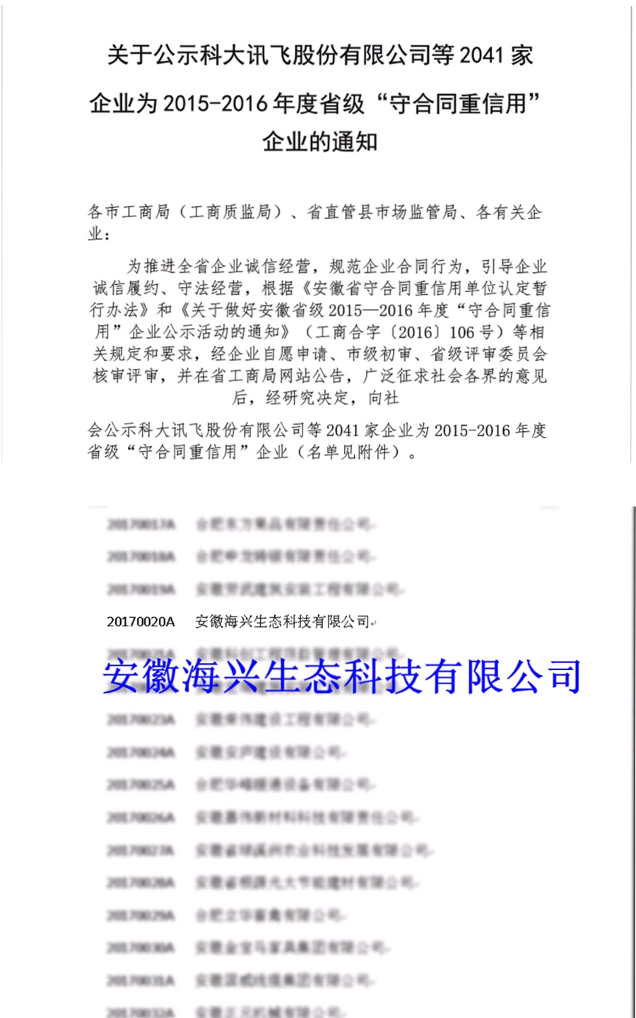 近日,安徽省工商行政管理局公布了2015-2016年度省级“守合同重信用”企业名单,我公司凭借诚信的经营方式和良好的合作信誉再次获得此项殊荣。