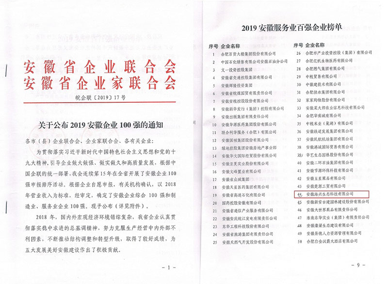 近日,安徽省企业联合会、省企业家联合会发布2019安徽企业100强名单,并首次完整发布了2019安徽服务业百强企业榜单和2019安徽制造业百强企业榜单名单。安徽海兴生态科技有限公司荣获“2019安徽服务业百强企业”,位列全省排名第44位。